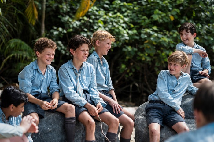 Чотири серії – це чотири імені в підзаголовках і чотири фокуси на центральних героях: Хрюші, Джеку, Саймоні і Ральфу. Чотири серії – це відчайдушна і самовиснажлива гра самих лише дітей, серед яких і підлітки, і хлопчики віку молодшої школи; дорослі ж (не враховуючи коротку фінальну сцену) фігурують лише у флешбеках, які схематично нібито вимальовують бекграунд ключових персонажів і пояснюють їхню більшу чи меншу психологічну травму як от смерть матері в Ральфа чи домашнє насилля з боку батька в родині Саймона (оскільки в романі жодних передісторій і жодних вказівок на тріснутий психоемоційний фундамент немає, деякі критики розцінили флешбеки як зайве намагання розтлумачити корінь зла або корінь вразливості, бо у Ґолдінґа йдеться якраз про абсолют і безпричинність людської монструозності чи так само абсолют і безпричинність приреченості, котрі просто є від утроби і колиски…, та короткочасні погляди назад точно не силяться що-небудь виправдати чи натякнути на необхідність низки терапевтичних сеансів, вони лише показують, що життя цих дітей було як до острова, так і буде після, проте напускна чистота їхніх життів брутально, фатально, незмінно втрачена).